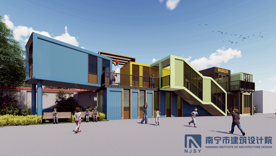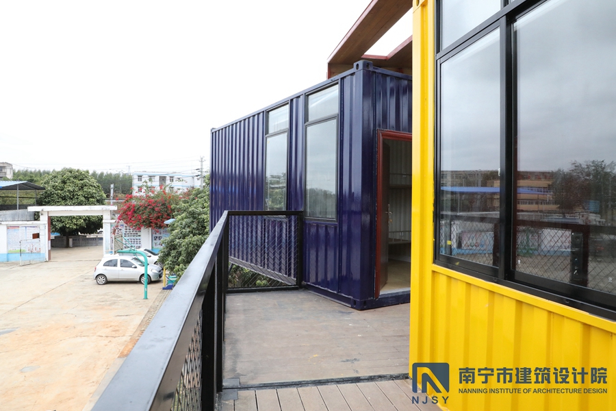 項目采用了集裝箱房屋的形式,由10個集裝箱構成,通過堆積木的形式,根據(jù)學生兒童所需的建筑風格和功能需求,將集裝箱橫豎排列,形成一定的退臺和露臺空間,為孩子們提供更多共享活動空間。