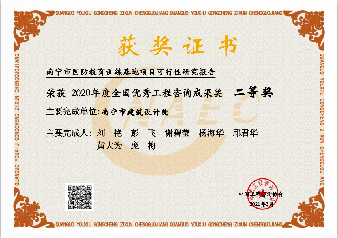 3月,中國(guó)工程咨詢協(xié)會(huì)發(fā)布了2020年度全國(guó)優(yōu)秀工程咨詢成果獎(jiǎng),由我公司申報(bào)的《南寧市國(guó)防教育訓(xùn)練基地項(xiàng)目可行性研究報(bào)告》獲得2020年度全國(guó)優(yōu)秀工程咨詢成果獎(jiǎng)二等獎(jiǎng)。此前,該成果報(bào)告還獲得了2020年度廣西優(yōu)秀工程咨詢成果一等等次。
